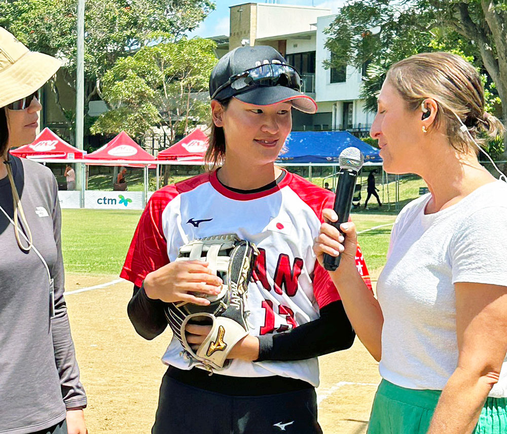 今大会、ニュージーランドとの4度目の対戦は10−0の5回コールド勝ち。7戦全勝となった試合後、本塁打を放った藤森捺未選手が現地メディアのインタビューに応える